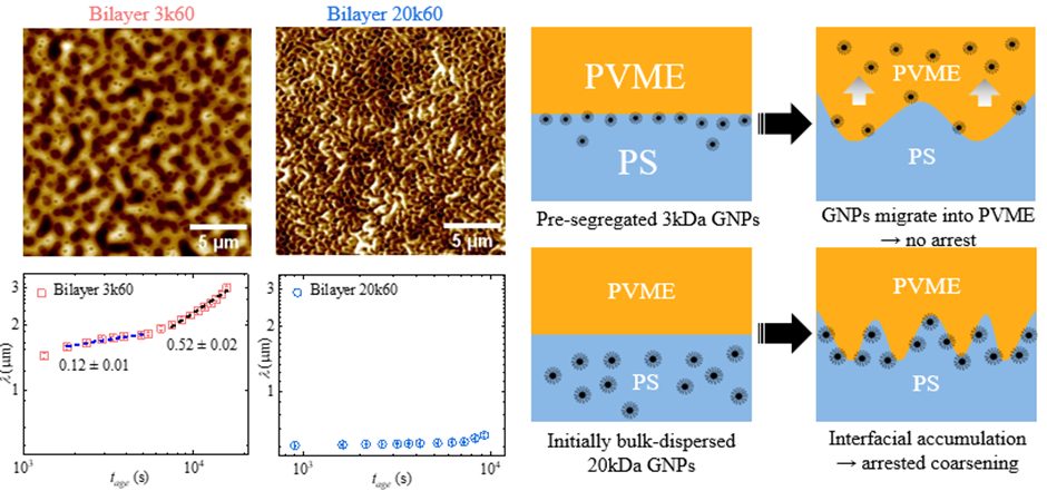 Understanding how nanoparticles organize and dynamically evolve at soft material interfaces is essential for designing advanced functional materials. In polymer blends undergoing phase separation, nanoparticles can migrate to the interface between immiscible polymer phases, where they assemble, and under certain conditions, become dynamically arrested or “jammed.” In our recent study (https://doi.org/10.1021/acs.macromol.5c02114), we directly probe the microscopic dynamics of such interfacial nanoparticles and reveal how their collective jamming controls the kinetics of phase separation in polymer blends.